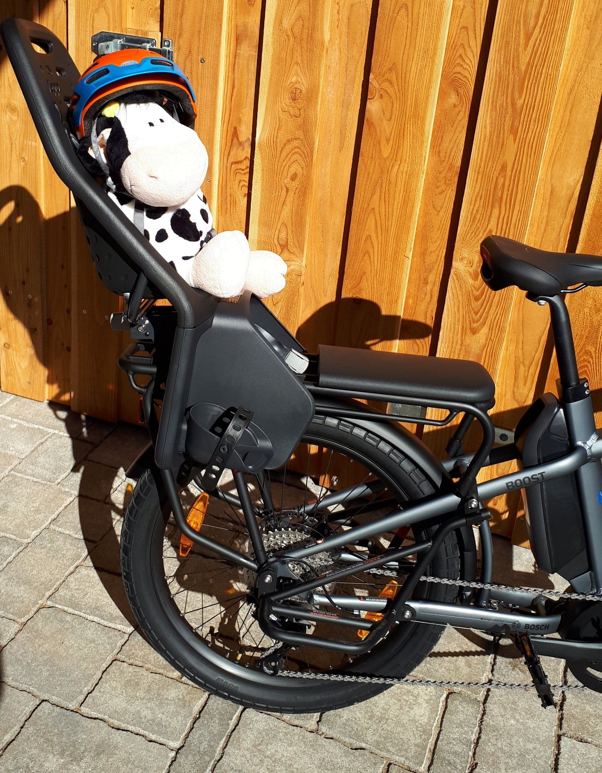 Der hintere Gepäckträger hat Aufnahmen um einen Thule Kindersitz an drei verschiedenen Positionen zu befestigen (einfach werkzeuglos einklicken), dadurch kann flexibel Platz für Gepäcktaschen oder die Sitzpolster für ein größeres Kind geschaffen werden (siehe Beispielbilder).